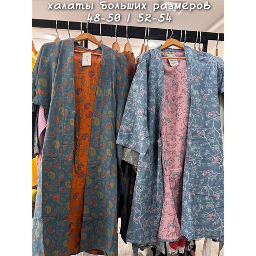 Мы представляем вам великолепный муслиновый халат-кимоно, который не только красиво выглядит, но и отлично подходит для любого времени года. Длина ниже колена и размеры до 54 делают его идеальным выбором для всех!
